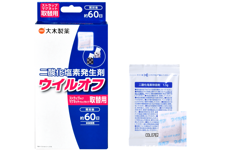 「電動拡散ファン」・「吊下げタイプ」の取替用二酸化塩素発生剤。本体の継続使用で経済的です。ウイルオフ